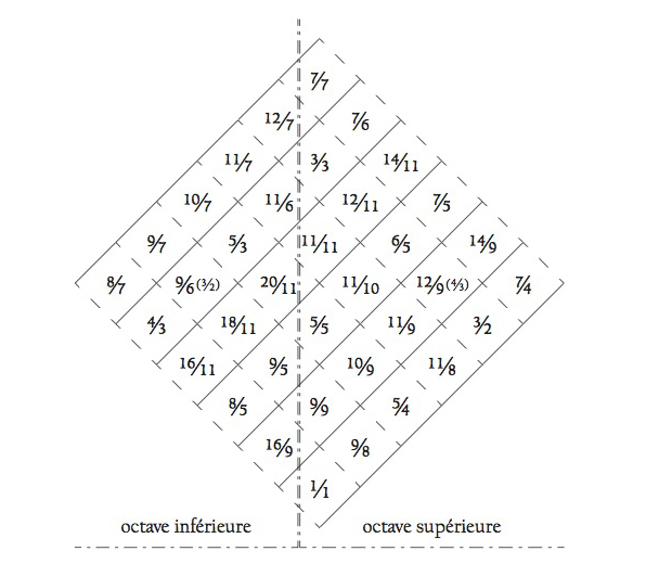The primary intervals (intervalles primaires) of Partch’s scale use ratios combining the prime numbers up to 11 (2, 3, 5, 7, 11), which makes this in Partch’s theory an “11-limit” scale, as compared to the “5-limit” of Renaissance just intonation (using only 2, 3, and 5). Secondary intervals (intervalles secondaires) include combinations of two primes: for example, 33/32 (33 = 3 x 11) and 21/16 (21 = 3 x 7). The irregular line tracing out the shape of the “one-footed bride” indicates the relative consonance of each interval: the fourth (4/3) and fifth (3/2), for example, are both highly consonant, while complex ratios like 33/32 (a quartertone above the tonic) are dissonant. Intervals are further classified into categories of suspense, power, emotion, and approach (suspensifs, pouvoir, émotion, and approche).