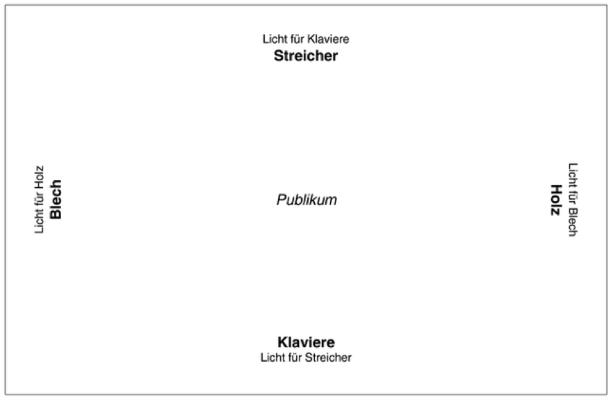 Sur scène, une grosse installation d’éclairages joue le rôle traditionnel du chef d’orchestre. L’orchestre est divisé en quatre groupes (cordes, vents, cuivres, claviers, chacun associé à un percussionniste) arrangés géométriquement autour du public qui est placé au centre. Chaque groupe est disposé de sorte à pouvoir observer les motifs changeants de la lumière sur le mur opposé de la salle ; ces motifs changeants gouvernent le déroulement temporel de l’œuvre grâce à des transformations abruptes, des assombrissements, des éclaircissements ou même grâce à une pulsation métronomique. Si l’élaboration des éclairages (et notamment le choix des couleurs) est laissée à la discrétion de l’éclairagiste, les durées de chaque changement sont soigneusement préprogrammées, telle « une machine qui – une fois mise en route – suit inexorablement son cours prédéterminé ».