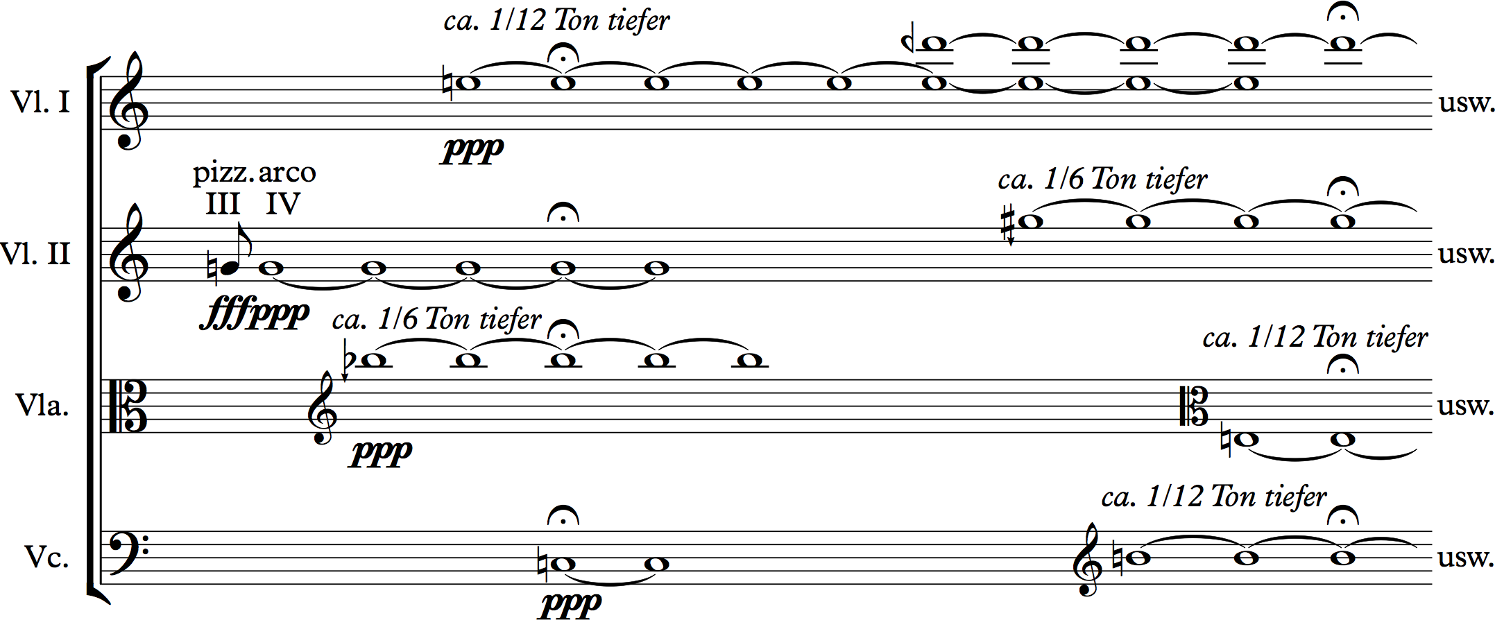La première section de la pièce est écrite en utilisant exclusivement les harmoniques des cordes à vide, à l’aide d’une technique instrumentale spécifique : plutôt que d’appuyer fortement sur la corde, les instrumentistes touchent la corde délicatement à des fractions simples de sa longueur (½, ⅓, ¼, etc.) la forçant ainsi à vibrer en tierces, quartes et quintes, etc., et à produire des sons plus aigus possédant des fréquences vibratoires qui sont des nombres multiples entiers de la fréquence de la corde à vide. Puisque que chacune des seize cordes à vide du quatuor est accordée différemment, et que l’on peut produire pour chaque corde des harmoniques allant jusqu’à la neuvième, on obtient un nombre énorme de possibilités de combinaisons micro-tonales qui donne lieu « à des gammes micro-tonales irrégulières et subtilement différenciées » pouvant aller parfois jusqu’à six subdivisions d’un seul demi-ton tempéré. Ces gammes forment le matériau de base du début de la pièce : nous entendons d’abord des combinaisons complexes d’harmoniques plutôt que les accords simples en intonation juste sur lesquels les cordes sont accordées.